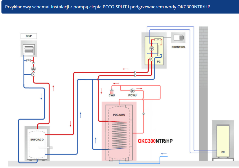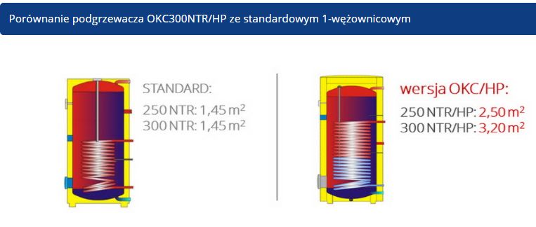 PodgrzewaczOKC300NTR/HPwyposażony jest standardowo w jeden wymiennik (wężownica grzejna). Wężownica cechuje się znacznie zwiększoną powierzchnią oddawania ciepła w porównaniu do podgrzewacza o tej samej pojemności, z jedną wężownicą przeznaczoną do współpracy z kotłem grzewczym. Zwiększona powierzchnia wężownicy pozwala utrzymać wymaganą wydajność grzewczą dla podgrzewania wody użytkowej, przy obniżonej temperaturze zasilania – rzędu 50-60°C. Zapewnione zostają także korzystne warunki pracy dla niskotemperaturowych źródeł ciepła – pompy ciepła, bądż kotła kondensacyjnego.