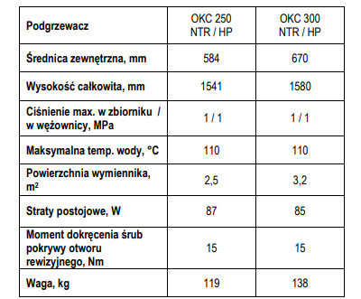 Dane techniczne – podgrzewacze OKC serii NTRR/HT