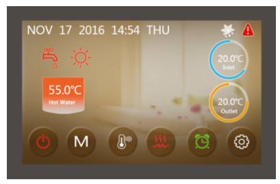 Sterownik o przekątnej 5” z ekranem dotykowym z menu w języku angielskim umożliwia wybór jednego z pięciu trybów pracy urządzenia oraz pozwala na współpracę z dodatkowym kotłem lub grzałką elektryczną w celu optymalizacji kosztów podgrzewania ciepłej wody użytkowej CWU lub alternatywnie instalacji CO. Program czasowy pozwala dopasować czas pracy urządzenia do wymogów danej inwestycji. Poniżej parametry sterownika: