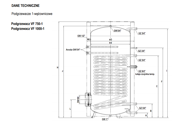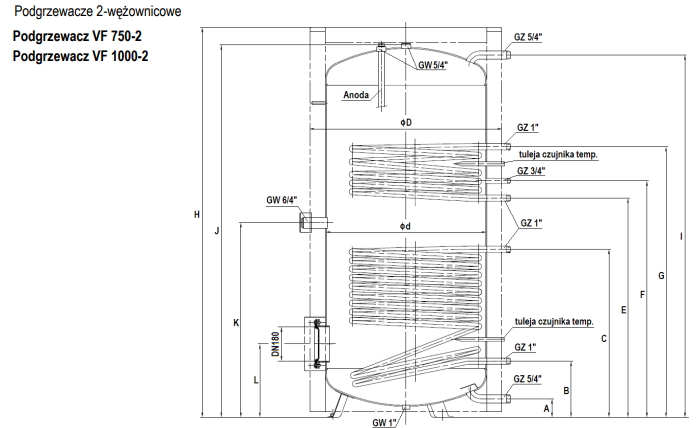 PodgrzewaczVF750-1wyposażony jest w jeden wymiennik (wężownica). Wężownica może być podłączona do instalacji solarnej lub kotła grzewczego stanowiąc jeden ze stopni podgrzewania wody użytkowej w większym systemie podgrzewania wody (złożonym z kilku podgrzewaczy).Podgrzewacz posiada dodatkowy otwór rewizyjny zabudowany w dolnej części, ułatwiający konserwację lub umożliwiający montaż ewentualnego dodatkowego osprzętu.