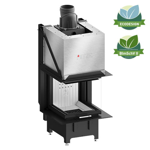 - Otwieranie paleniska z zastosowaniem nowego mechanizmu gilotyny dającego szczelność wkładu, bezpieczeństwo przed otwarciem przez dzieci oraz z dostępem serwisowym.