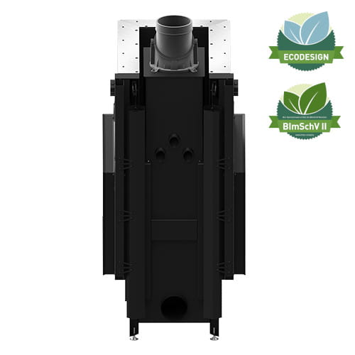 - Poprawa parametrów spalania oraz sprawności dzięki wyłożeniu komory spalania ogniotrwałymi ceramicznymi panelami z betonu ceramicznego akumulującymi ciepło w komorze spalania. Otwory w tylnej ścianie paleniska to niezależnie dopowietrzony system dopalania spalin.