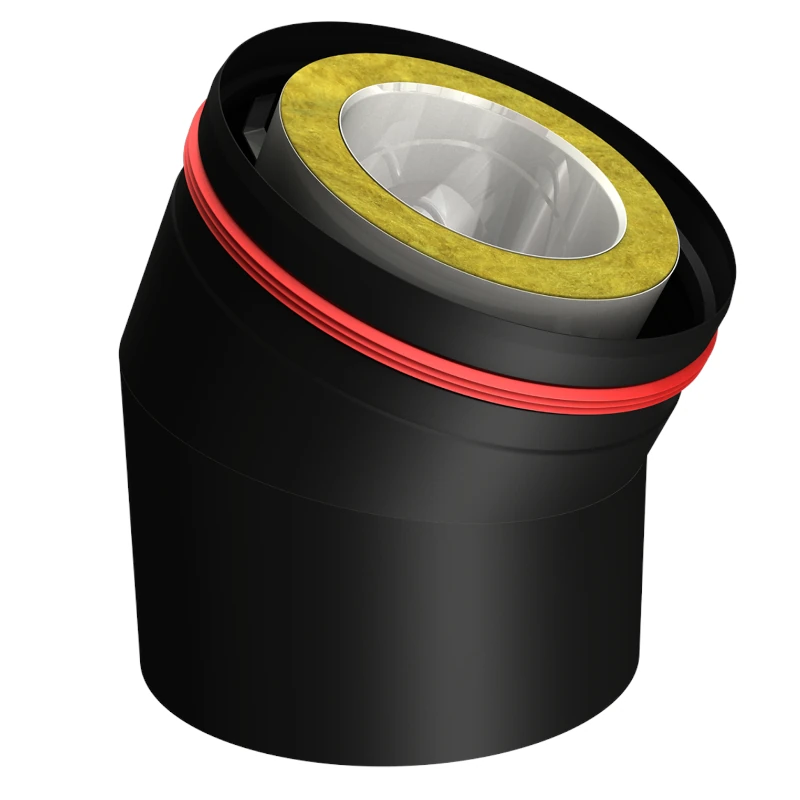 Kolano komina Aero o kącie 27°. Płaszcz wewnętrzny z blachy kwasoodpornej 0,5-0,6mm; izolacja z wełny mineralnej; płaszcz środkowy z blachy nierdzewnej 0,5mm; przestrzeń powietrzna; płaszcz zewnętrzny spęczany z blachy nierdzewnej 0,6mm malowany proszkowo na kolor czarny; dostępne średnice płaszcza wewnętrznego: 130, 150, 180mm
