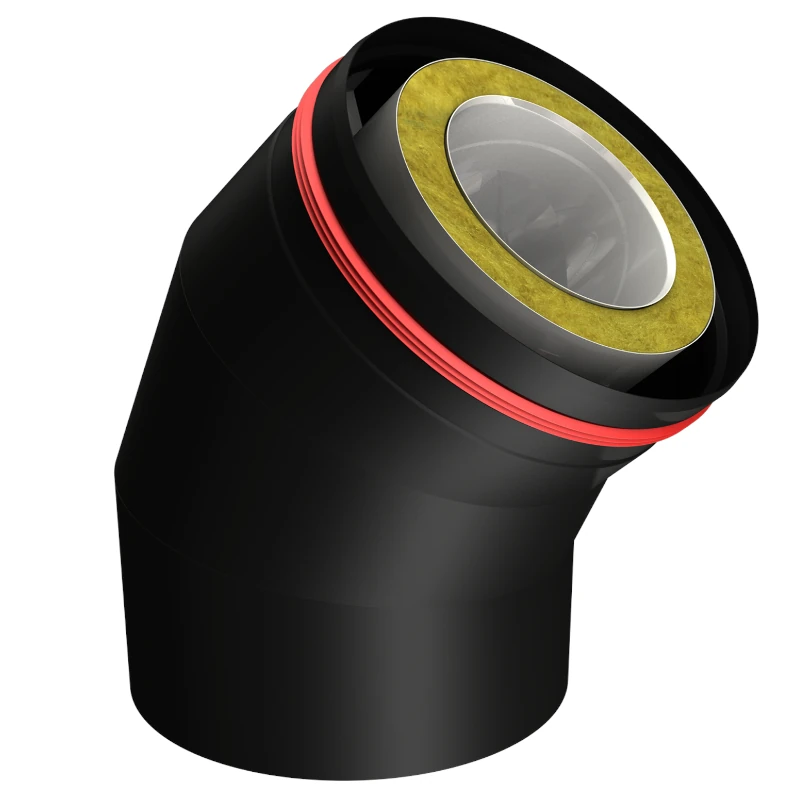Kolano komina Aero o kącie 45°. Płaszcz wewnętrzny z blachy kwasoodpornej 0,5-0,6mm; izolacja z wełny mineralnej; płaszcz środkowy z blachy nierdzewnej 0,5mm; przestrzeń powietrzna; płaszcz zewnętrzny spęczany z blachy nierdzewnej 0,6mm malowany proszkowo na kolor czarny; dostępne średnice płaszcza wewnętrznego: 130, 150, 180mm