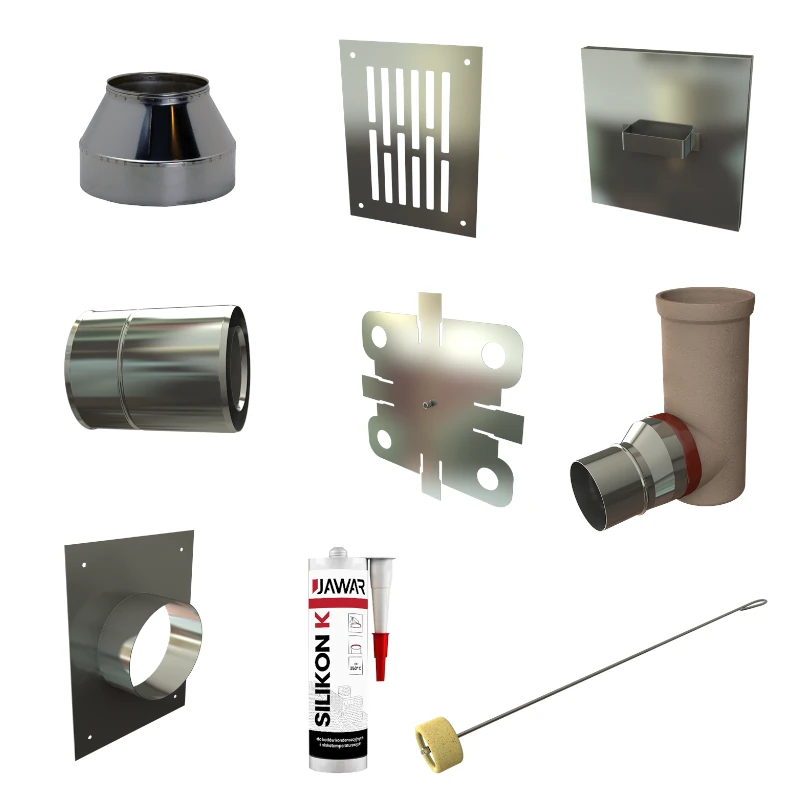 Silikon Jawar K 300ml (2 kartusze), szablon do nakładania zaprawy, stożek kominowy, kratkę nawiewną 13x17cm (2szt), przyłącze powietrza JAWAR K, adapter JAWAR K, redukcję do kolana izostatycznego, przyrząd do wygładzania spoin, blachę dolną komina.