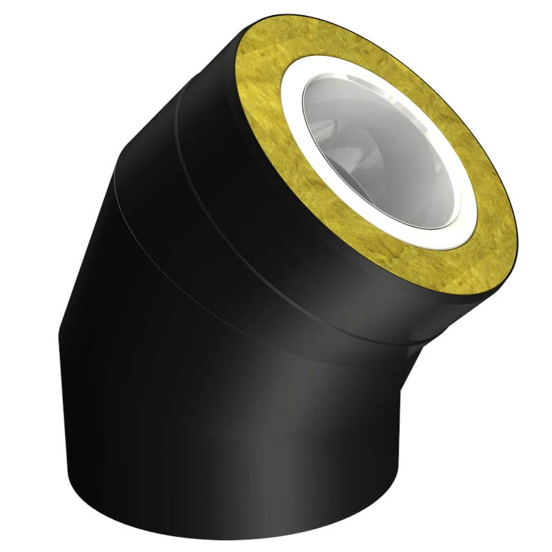 Kolano komina Smooth o kącie 45°. Płaszcz wewnętrzny z blachy kwasoodpornej 0,5 – 0,6mm; izolacja z włókien glinokrzemianowych; płaszcz zewnętrzny spęczany z blachy nierdzewnej 0,6mm malowany proszkowo na kolor czarny; dostępne średnice płaszcza wewnętrznego: 130, 150, 180, 200mm