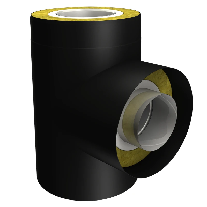 Trójnik przyłączeniowy komina Smooth o kącie 90°. Płaszcz wewnętrzny z blachy kwasoodpornej 0,5 – 0,6mm; izolacja z włókien glinokrzemianowych; płaszcz zewnętrzny spęczany z blachy nierdzewnej 0,6mm malowany proszkowo na kolor czarny; dostępne średnice płaszcza wewnętrznego: 130, 150, 180, 200mm
