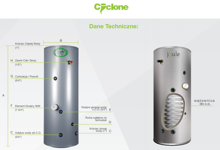 Gama jedno-wężownicowych zasobników Cyclone C.W.U. INDIRECT to jakość i wydajność w jednym. Niezwykle szeroka oferta daje pewność, że znajdziesz model dla siebie. Wraz z wprowadzeniem klas energetycznych zgodnie z dyrektywą unijną ERP Joule jest w stanie zaoferować zasobniki klasy A, B oraz C. Jakość, którą znacie jest dostępna we wszystkich ocenianych zbiornikach. Seria Cyclone jest znana ze swojego atrakcyjnego szarego wykończenia. Łatwo można zauważyć, że na zewnętrznej obudowie nie zastosowano żadnego taniego plastiku. Wewnątrz zastosowano tylko najlepsze materiały. Korpus ze stali nierdzewnej DUPLEX, króćce oraz wężownice ze stali nierdzewnej 316L. Zbiornik zaizolowany twardą, gęstą pianką poliuretanową. Oferujemy Państwu zbiorniki wysokiej jakości, czego przejawem jest 12 letnia gwarancja na cały zasobnik.