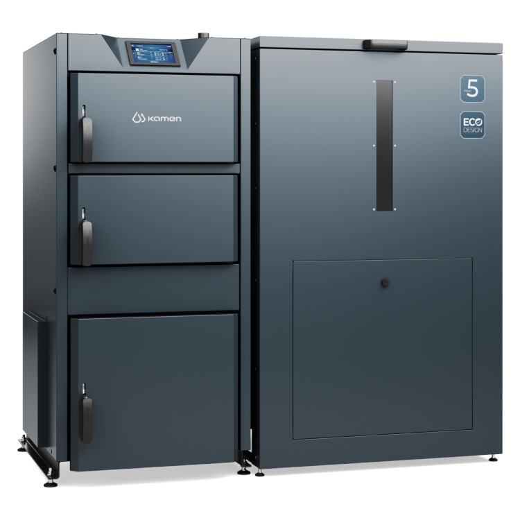 - Samoczyszczący palnik pelletowy Kamen Fenix umieszczony zboku kotła