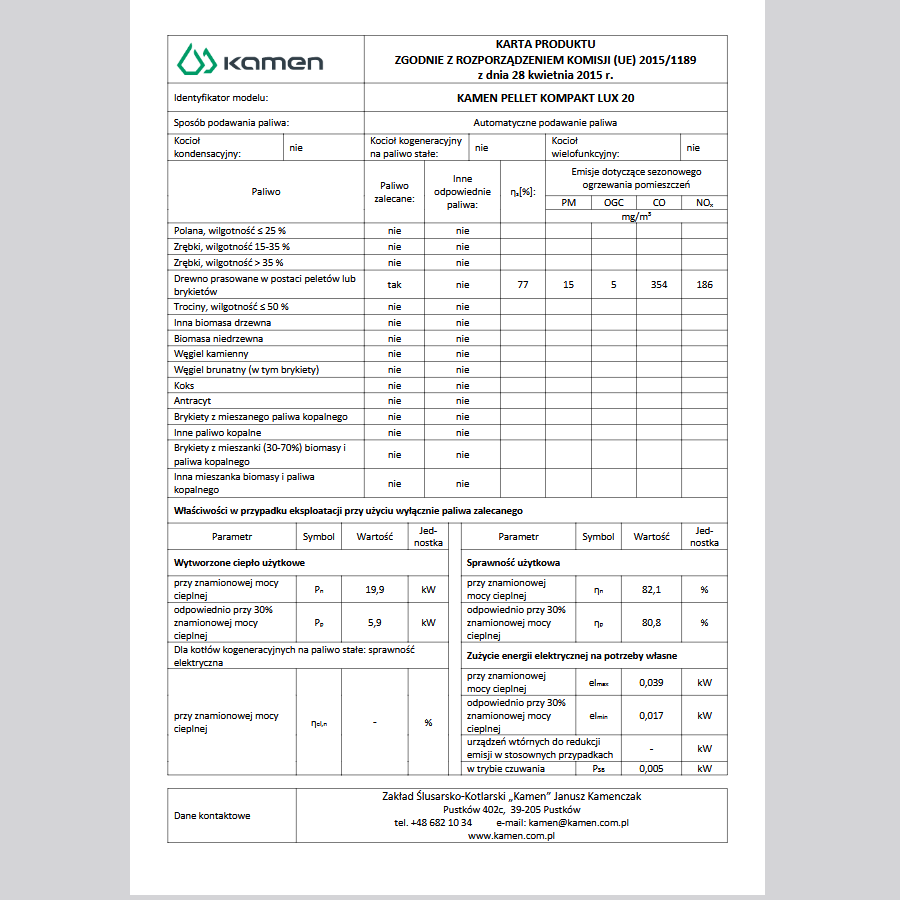 | Parametr | Jedn. | Pellet Kompakt LUX | |||