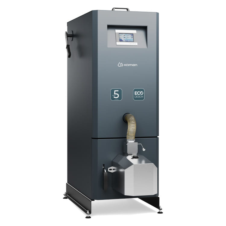 kompaktowy kocioł zwbudowanym zasobnikiem paliwa, wyposażony wsamoczyszczący automatyczny palnik iprosty wobsłudze, stabilny wdziałaniu sterownik, stosowane biopaliwo – pellet 6-8 mm