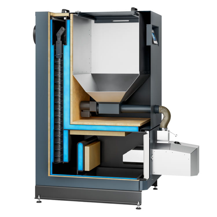 kompaktowy kocioł zwbudowanym zasobnikiem paliwa, wyposażony wsamoczyszczący automatyczny palnik iprosty wobsłudze, stabilny wdziałaniu sterownik, stosowane biopaliwo – pellet 6-8 mm