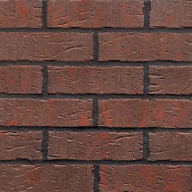 Płytka klinkierowa utrzymana wdomowym, ciepłym klimacie. Red house tostylowy, ciemny klinkier, oszorstkiej, nieregularnej strukturze.