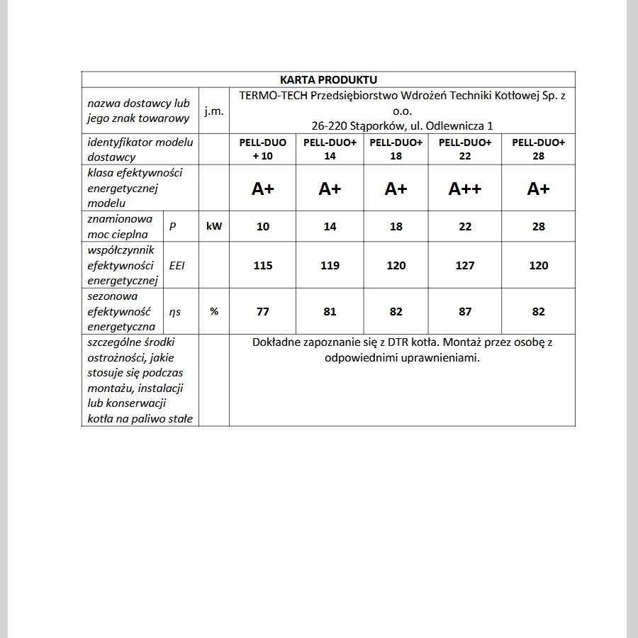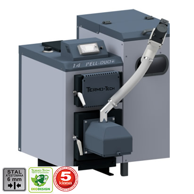 Kotły typu PELL-DUO + z palnikiem pelletowym, przeznaczone są do wodnych instalacji centralnego ogrzewania systemu otwartego, z grawitacyjnym jak i wymuszonym obiegiem wody. Kotły stanowią konstrukcję stalową spawaną, z blach atestowanych gwarantujących długotrwałe użytkowanie, odpornych na działające na nie w czasie eksploatacji czynniki, gdzie realizowana jest wysokoefektywna technika spalania jednostkowej dawki paliwa w ściśle określonych warunkach. Są wyposażone w specjalnie skonstruowany palnik wykonany ze stali gatunkowych, do którego podawane jest paliwo z zasobnika za pomocą podajnika ślimakowego. Powietrze do spalania doprowadzane jest przez wentylator elektryczny do układu dysz w palenisku. Praca kotłów, sterowana jest za pomocą zaprogramowanego sterownika elektronicznego sterującego procesem spalania. Sterownik realizuje rozpalanie paliwa jak i wygaszenie paleniska w przypadku osiągnięcia temperatury zadanej. Może również pracować w sposób ciągły, używając do tego celu opcji podtrzymania. W drzwiczkach dolnych znajduje się palnik pelletowy połączony z podajnikiem ślimakowym za pomocą przewodu elastycznego stanowiącego dodatkowe zabezpieczenie. Cały kocioł jest zaizolowany wełną mineralną i obudowany blachą stalową.