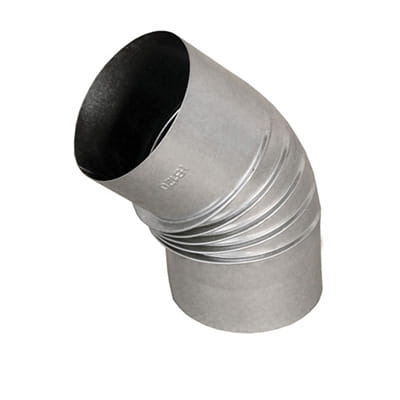 Kolano FAL o stałym kącie zgięcia 45 S, zawijane na zakładkę, przeznaczone do odprowadzania spalin z urządzeń opalanych gazem lub olejem opałowym do przewodów kominowych. Kolano wykonane z czarnej blachy stalowej aluminizowanej.