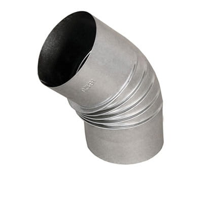 Kolano FAL o stałym kącie zgięcia 45 S, zawijane na zakładkę, przeznaczone do odprowadzania spalin z urządzeń opalanych gazem lub olejem opałowym do przewodów kominowych. Kolano wykonane z czarnej blachy stalowej aluminizowanej.
