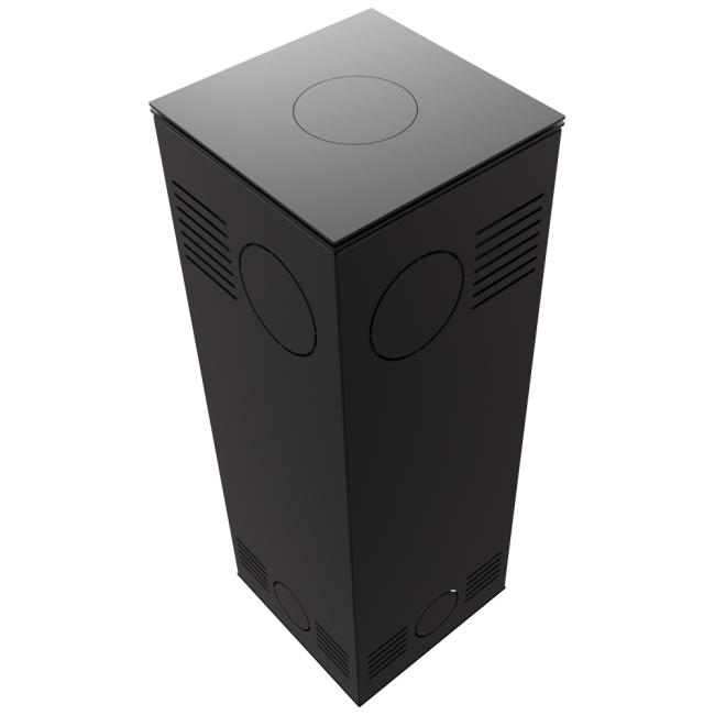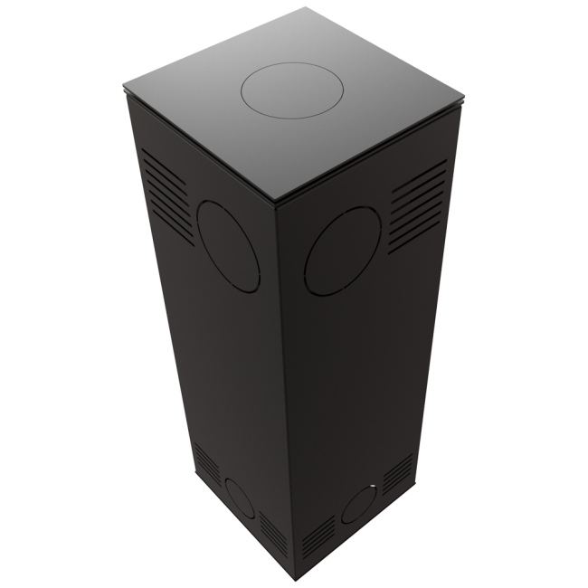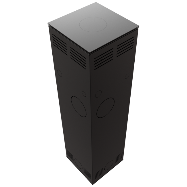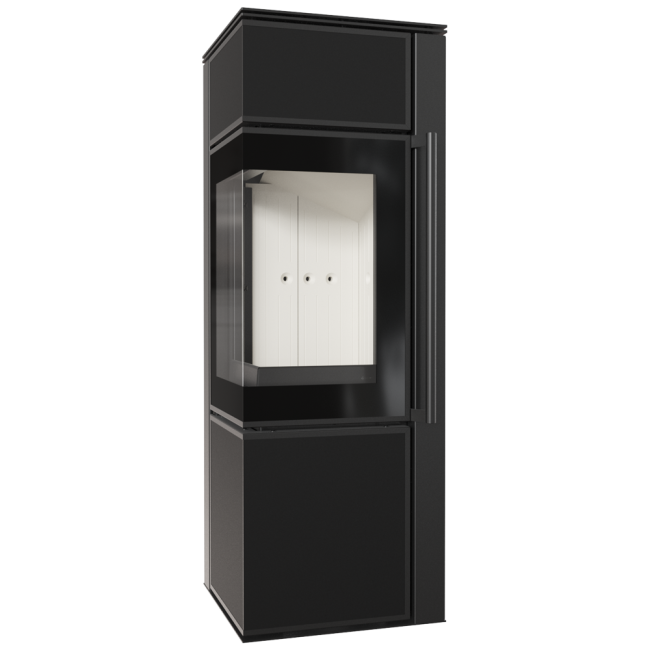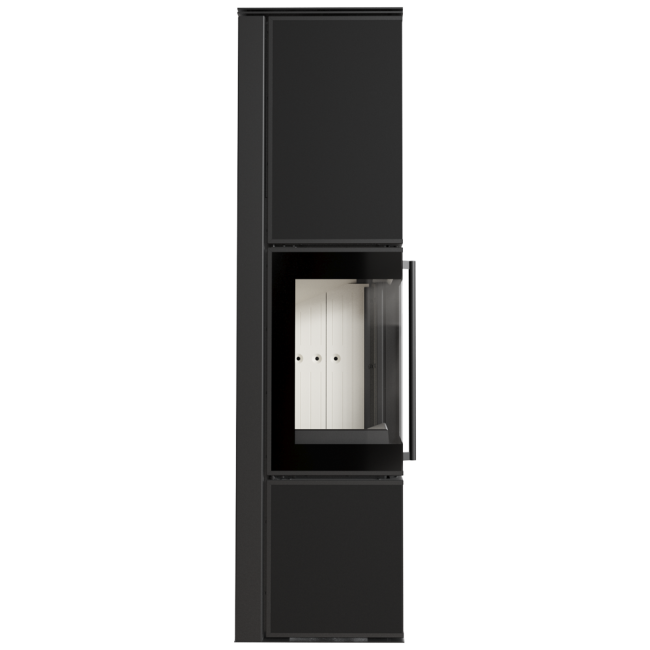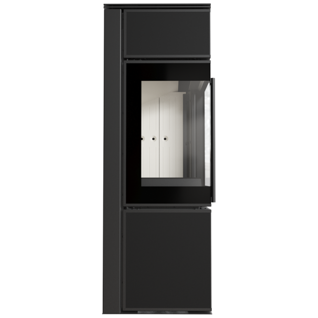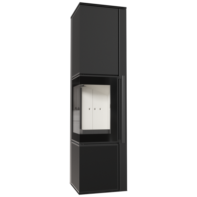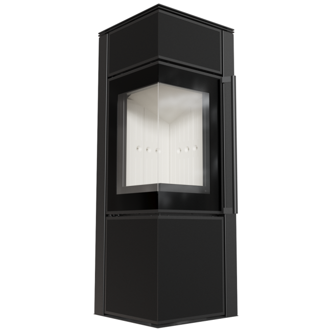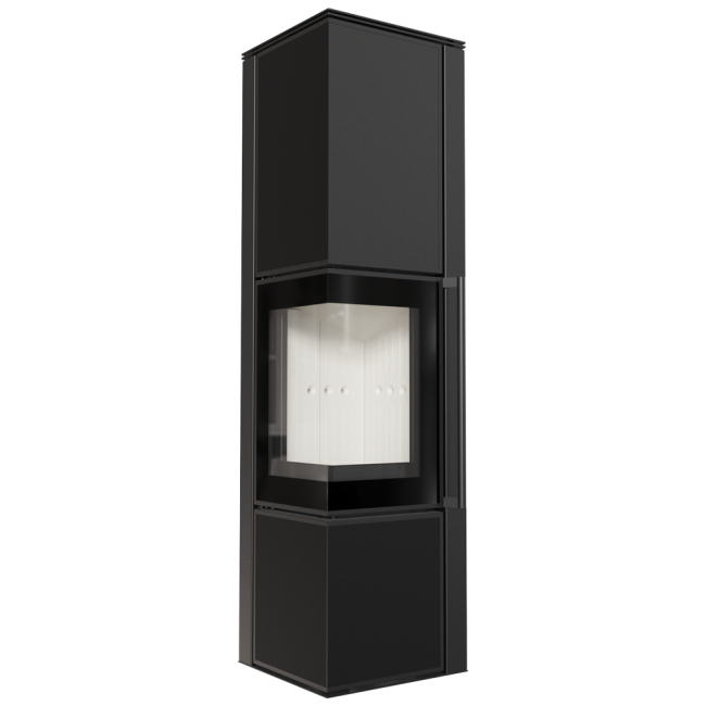 TORA to piec stalowy wykończony płytą ze spieku kwarcowego w eleganckim kolorze Nero Assoluto i dwustronnym przeszkleniem. Wyposażony w narożne drzwi ozdobione czernionym przeszkleniem, dla pogłębienia wizji ognia.