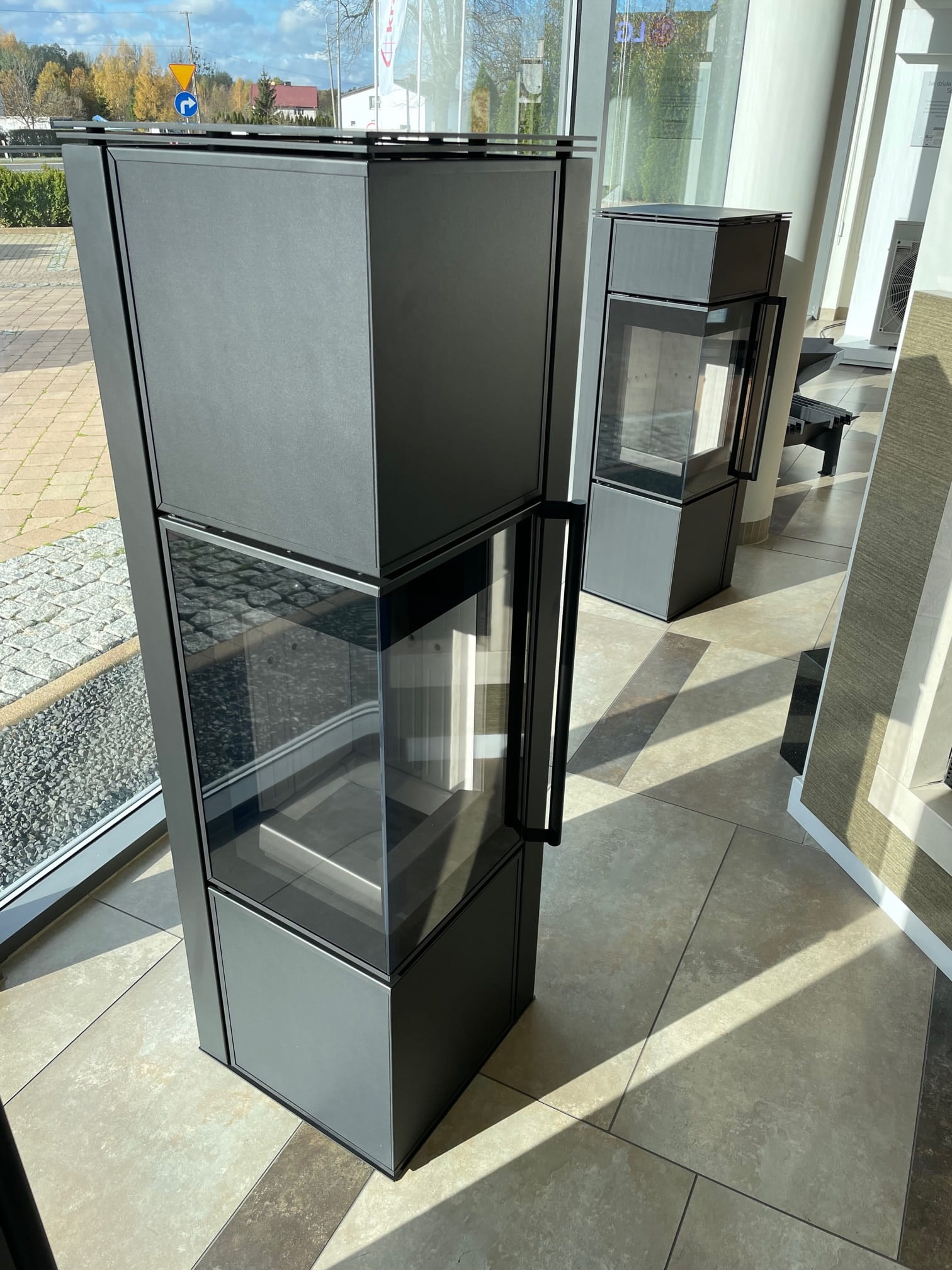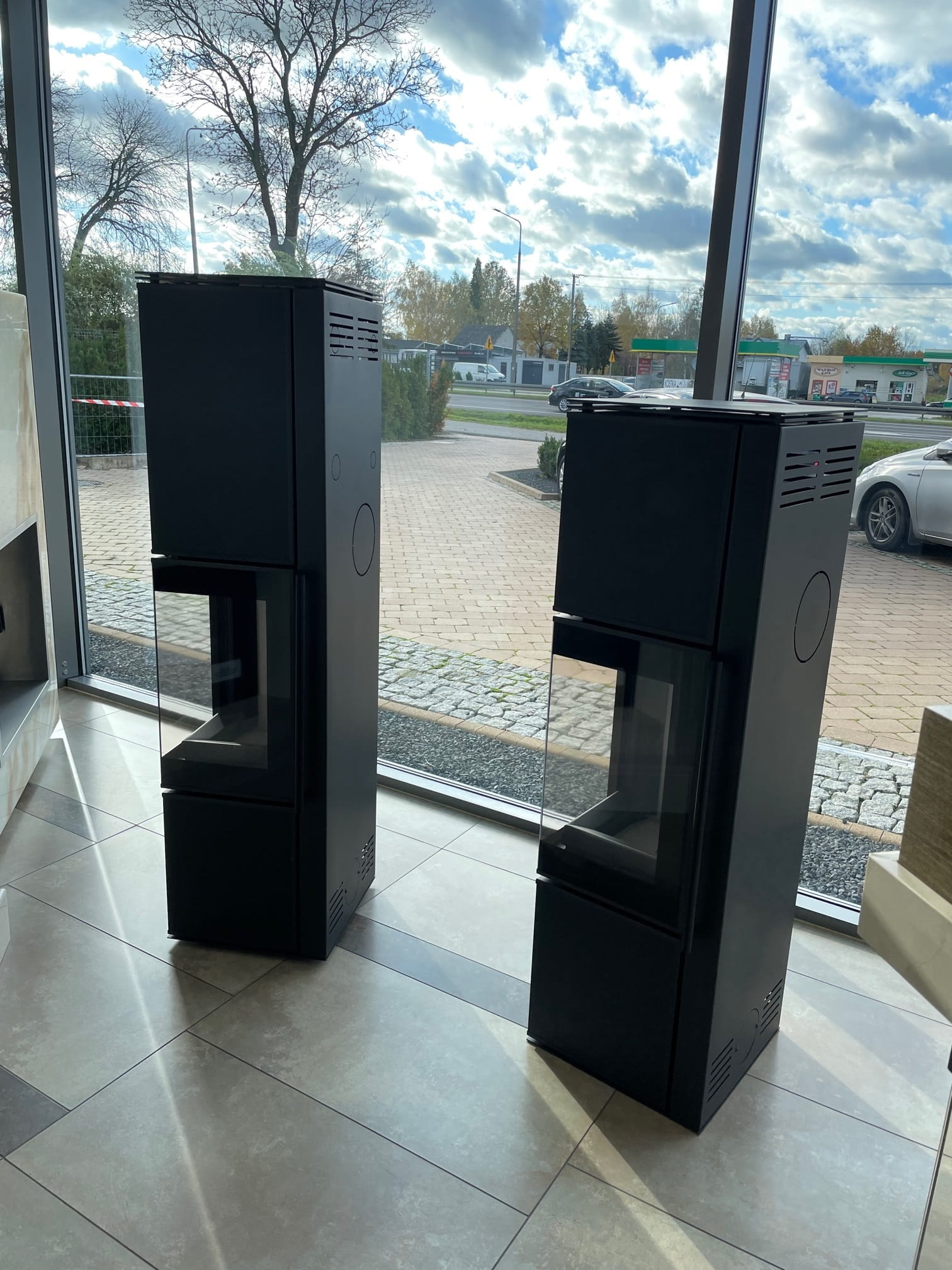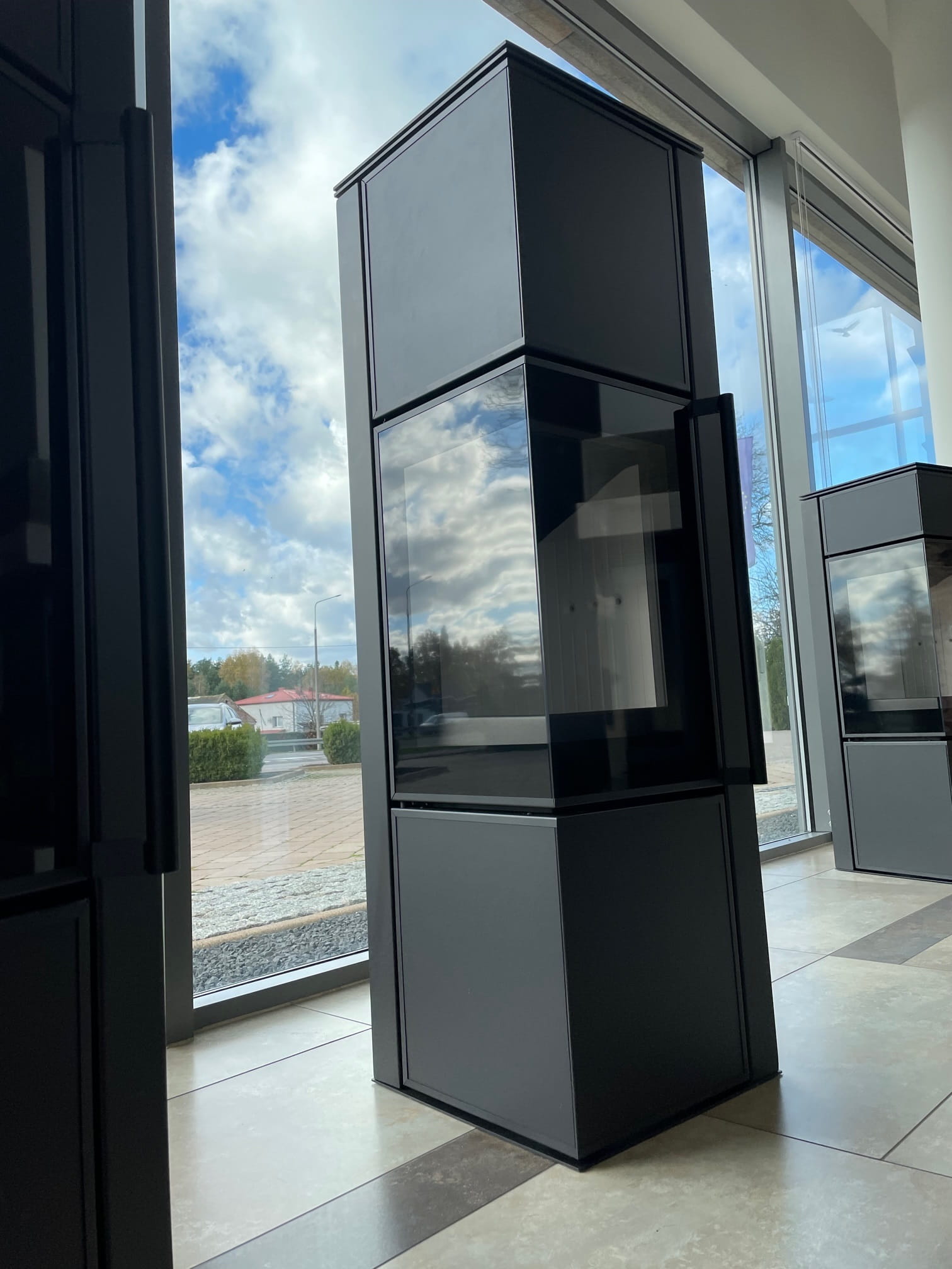 Przestronne przeszklenie uatrakcyjnia wizję ognia, a dodatkowa ozdobna szyba typu glass podkreśla jego urok. Wnętrze pieca wyłożone TERMOTEC doskonale kontrastuje z bryłą, nadając całości nowoczesnego wyglądu.