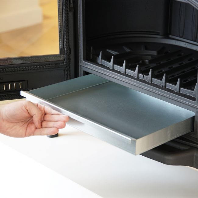 Szuflada/pojemnik na popiół, w których gromadzą się pozostałości po spalonym drewnie oraz ruchomy ruszt, ułatwiający usunięcie popiołu.