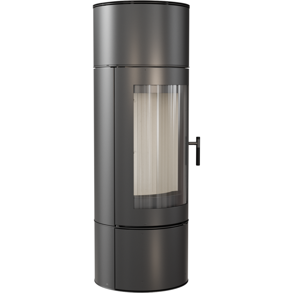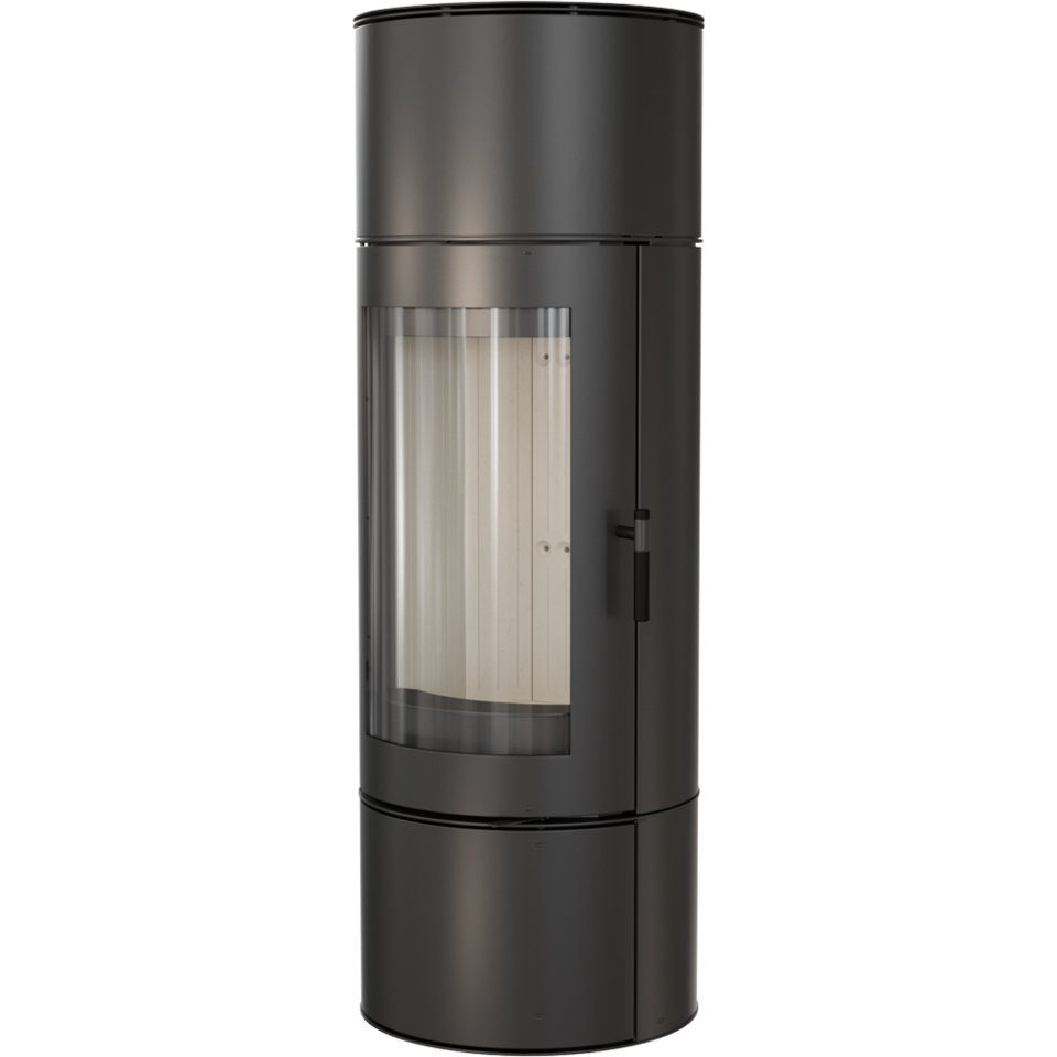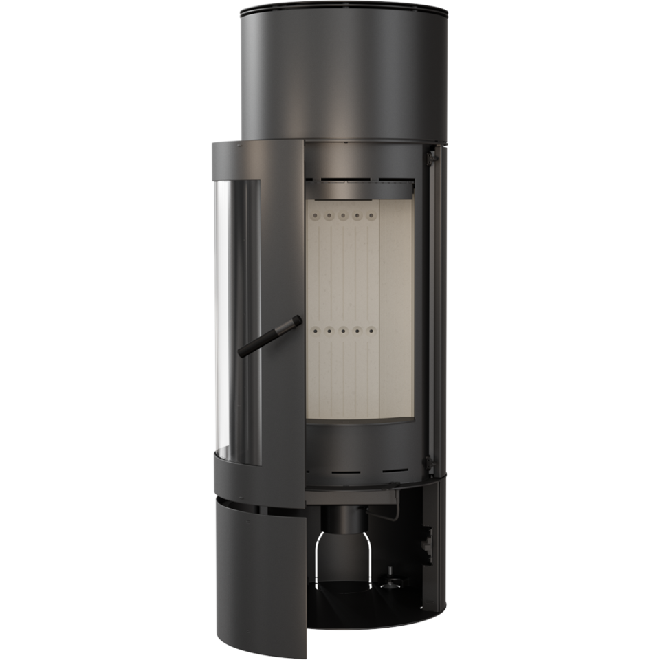 Przestronne przeszklenie uatrakcyjnia wizję ognia. Wnętrze pieca wyłożone innowacyjnym materiałem TERMOTEC doskonale kontrastuje z bryłą, nadając całości nowoczesnego wyglądu.