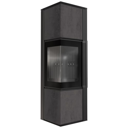 TORA to nowoczesny piec stalowy na drewno wykończony wykończony płytą ze spieku kwarcowegoi dwustronnym przeszkleniem. Wyposażony jest w narożne drzwi ozdobione czernionym przeszkleniem celem pogłębienia wizji ognia. Piec posiada wygodny uchwyt w formie relingu do otwierania drzwi. Jest to piec, który oferuje wygodę i bezpieczeństwo użytkowania, przy jednoczesnym nowoczesnym designie.