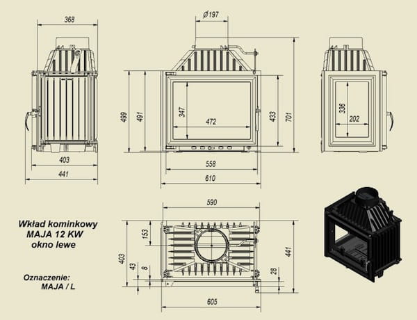 | Wyposażenie | - nawiew powietrza na szybę - wymienna tylna płyta - ogranicznik drewna - ruszt uszczelka z pamięcią kształtu |