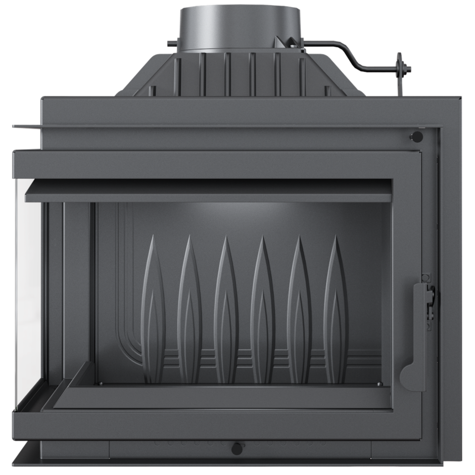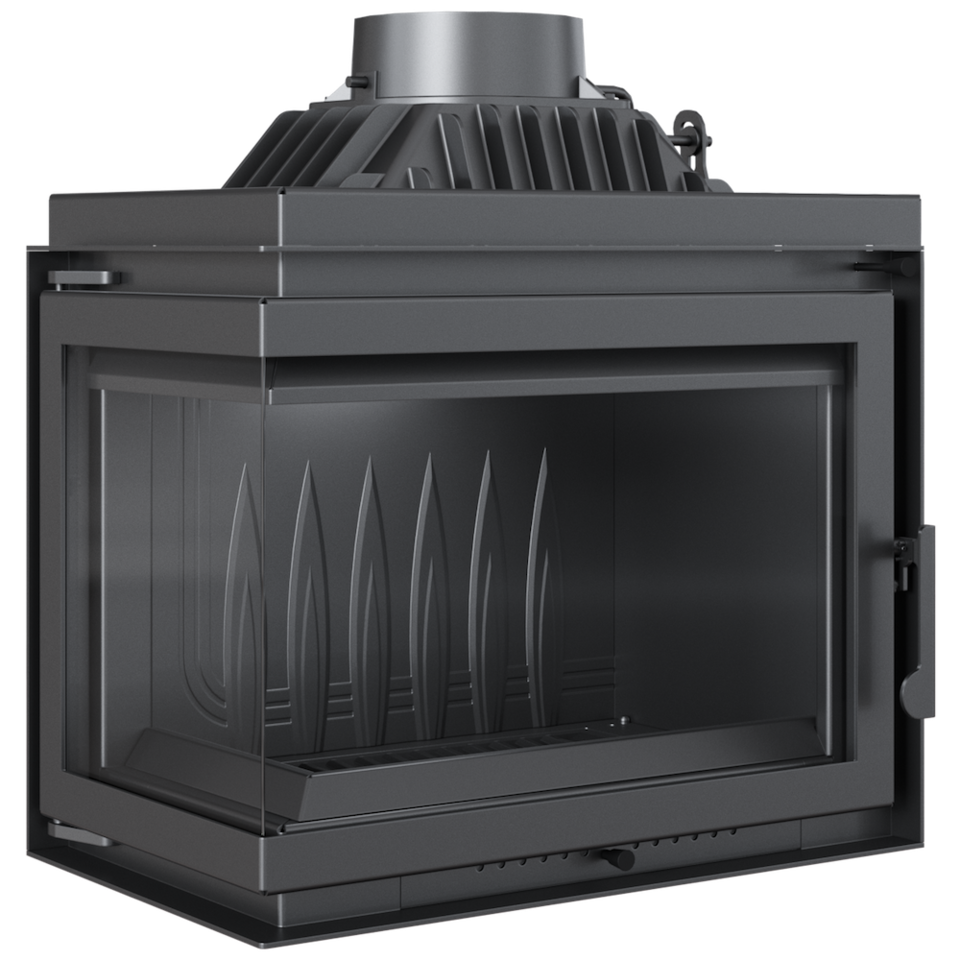 Narożny wkład kominkowy o drzwiach typu BS (szyby łączone), wyposażony w pojedynczą szybę.