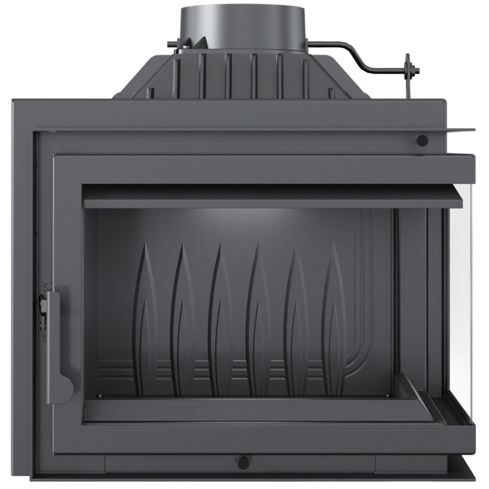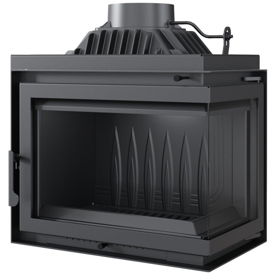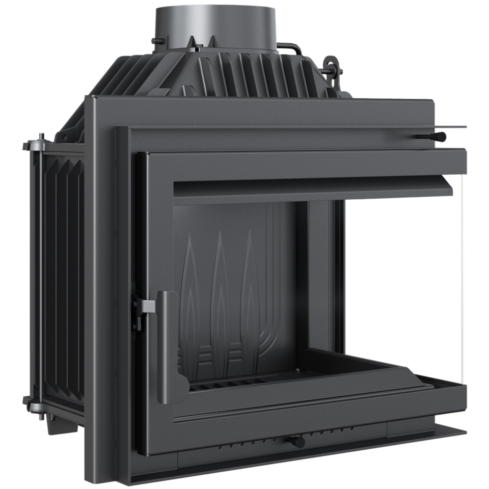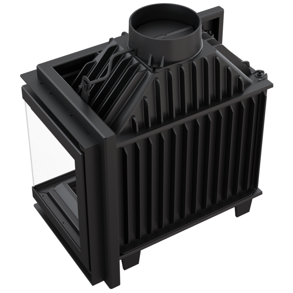 Narożny wkład kominkowy o drzwiach typu BS (szyby łączone), wyposażony w pojedynczą szybę.
