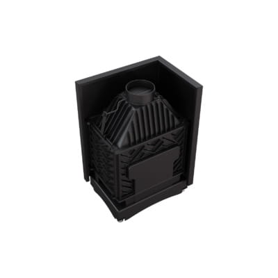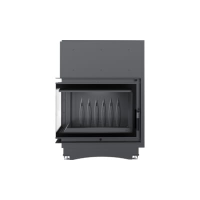 Nowoczesny front wkładu wykonany ze stali, wyposażony w dekoracyjną ceramikę żaroodporną wytrzymującą temperaturę do 800°C. Zamontowane szkło posiada certyfikat jakości i bezpieczeństwa. Ozdobna szyba typu glass, nie tylko wygląda elegancko i nowocześnie, ale przede wszystkim zastosowanie tego rozwiązania optycznie powiększa front wkładu i podkreśla wizję ognia. Rama drzwi wykonana jest z zamkniętego profilu, co sprawia, że są one stabilne i wytrzymałe na naprężenia występujące podczas pracy w wysokich temperaturach.