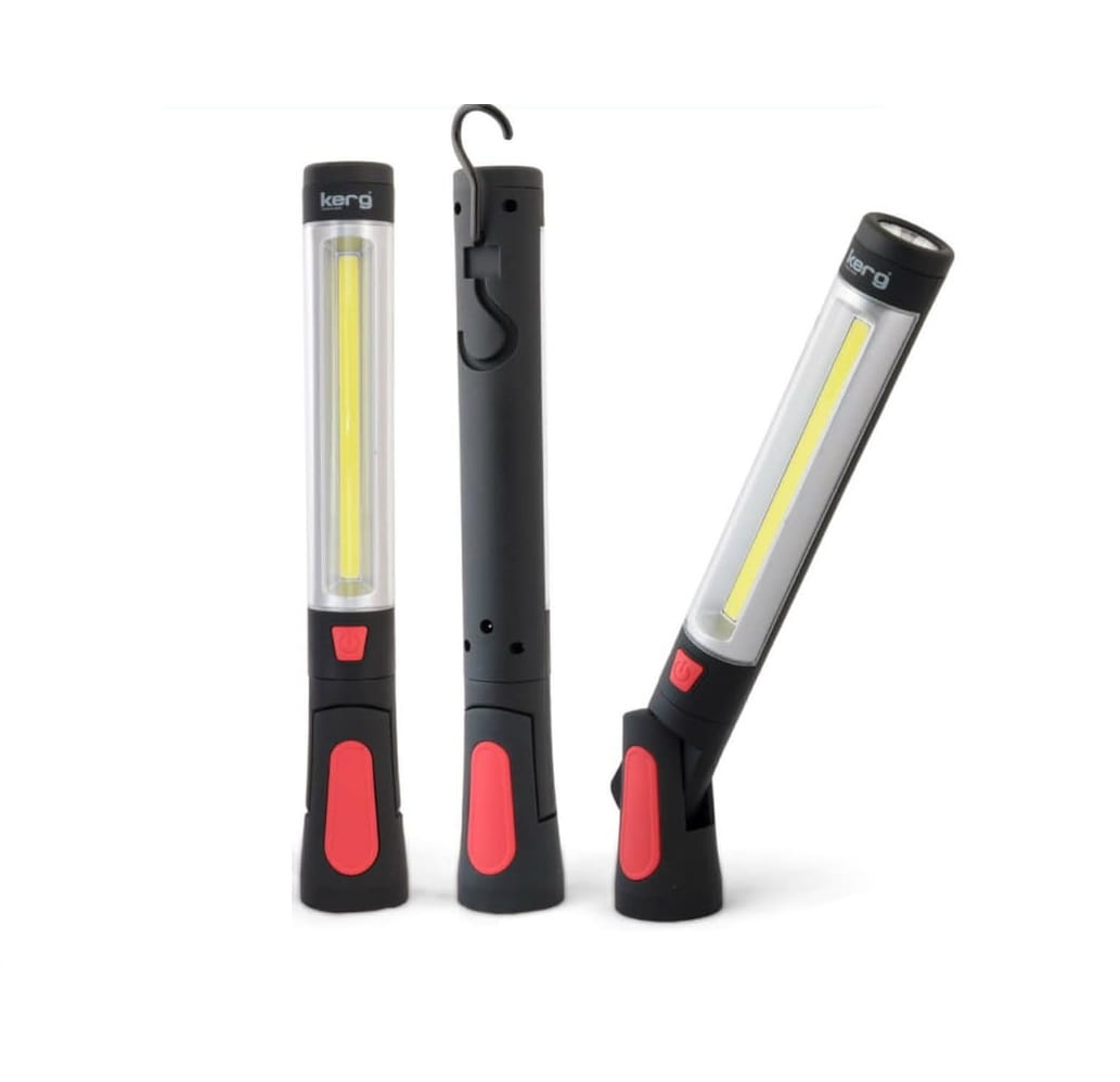 LAMPKA AKUMULATOROWA OBROTOWA LED COB 3W+ Power LED 3W KERG Dane techniczne: Źródło światła: COB LED + LED Moc źródła światła: 230 lm + 85 lm Moc: 3 W Zasilanie: akumulator Akumulator: litowy 800 mAh Materiał obudowy: tworzywo sztuczne (PVC) Hak do zawieszania: tak Magnes: w podstawie