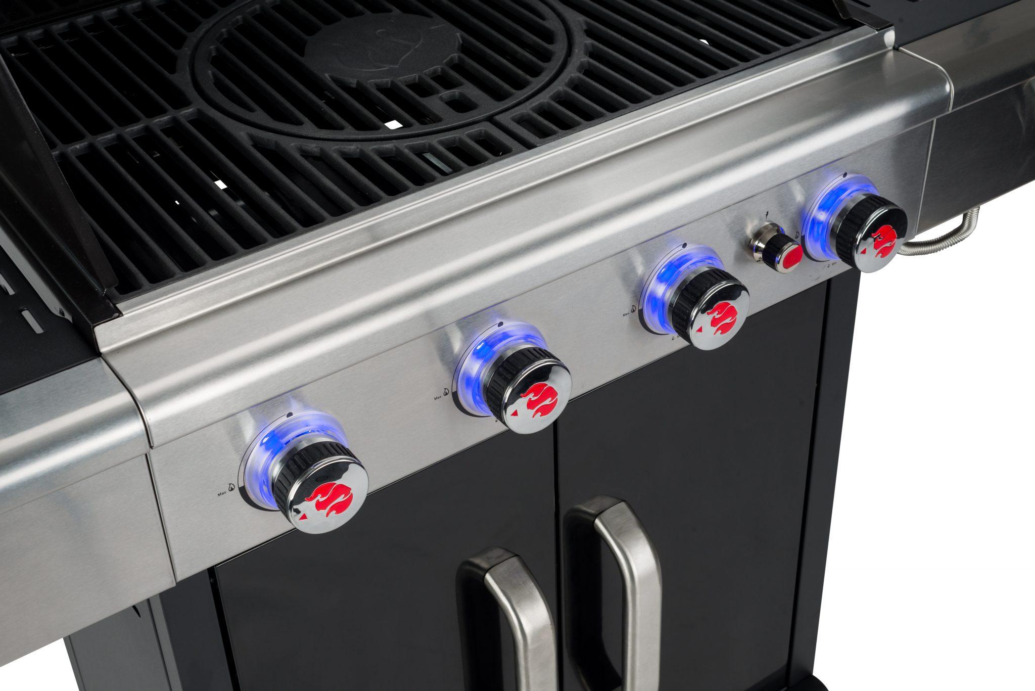 Napokrywie grilla znajdziemy standardowy termometr, który zapewnia kontrolę nad temperaturą grillowania.Na przedniej części grilla umieszczono panel z 5podświetlanymi (diodami LED) regulatorami płomienia, które umożliwiają pełną kontrolę nad intensywnością grillowania. Grill posiadaautomatyczną iskrę, dzięki czemu po przyciśnięciu przycisku i przekręceniu gałki następuje samoczynny zapłon gazu.