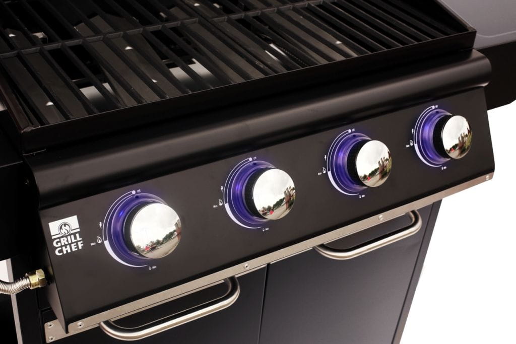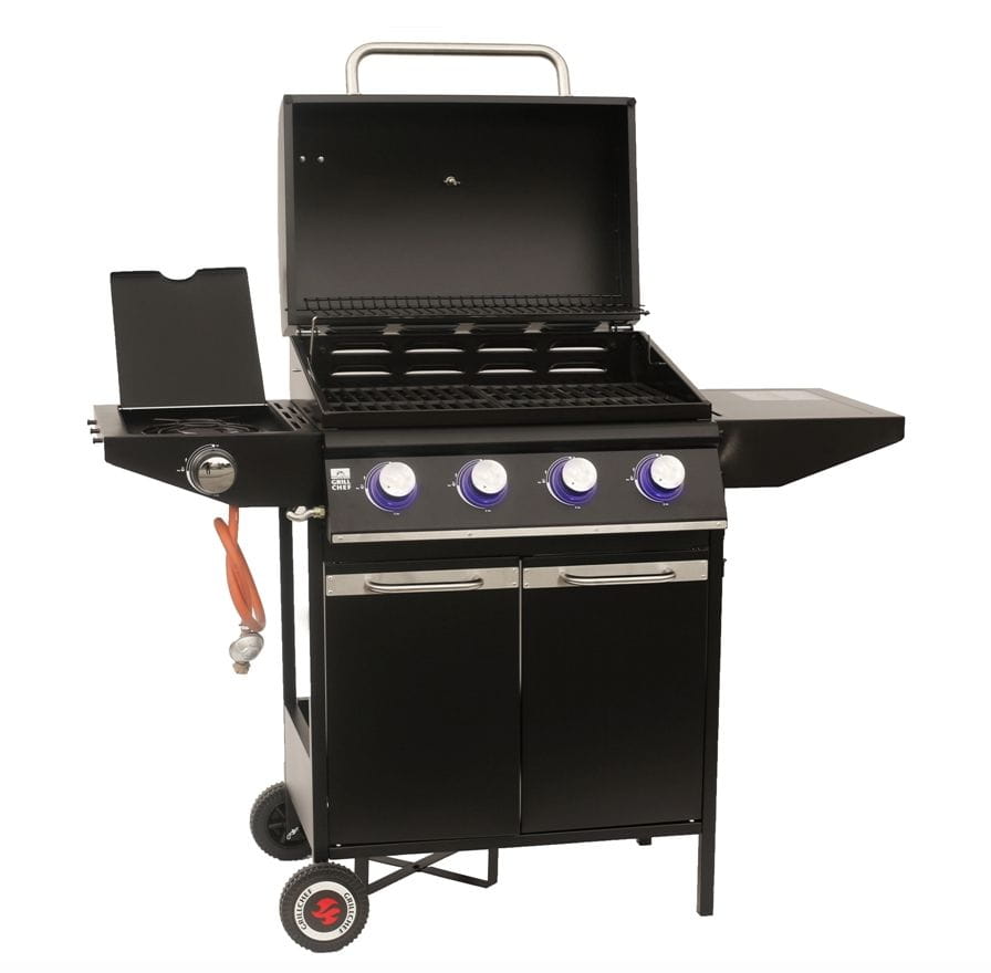 Piąty palnik umieszczony jest osobno na półeczce po lewej stronie od powierzchni do grillowania i służy do gotowania (np. do przygotowywania dodatków, sosów lub ciepłych napojów). Analogicznie w prawo od korpusu grilla znajduje się półeczka ze zintegrowanymi wieszakami na naczynia do grillowania. Możesz tam odłożyć na przykład miski, talerze, sztućce lub serwetki, aby zawsze mieć je pod ręką. Pod korpusem grilla znajduje się zamykana szafeczka do przechowywania butli z gazem. Dzięki dwóm kółeczkom cały grill wraz z butlą gazową jest łatwy w przemieszczaniu – łatwo przewieziesz go na taras lub do ogrodu, albo po prostu tam, gdzie planujesz grillować. Częścią grilla jest także zestaw do podłączenia butli PB zawierający węża zasilającego i regulowany wentyl ciśnieniowy.Parametry grilla 16 kW GrillChef XL HIT 4.1: