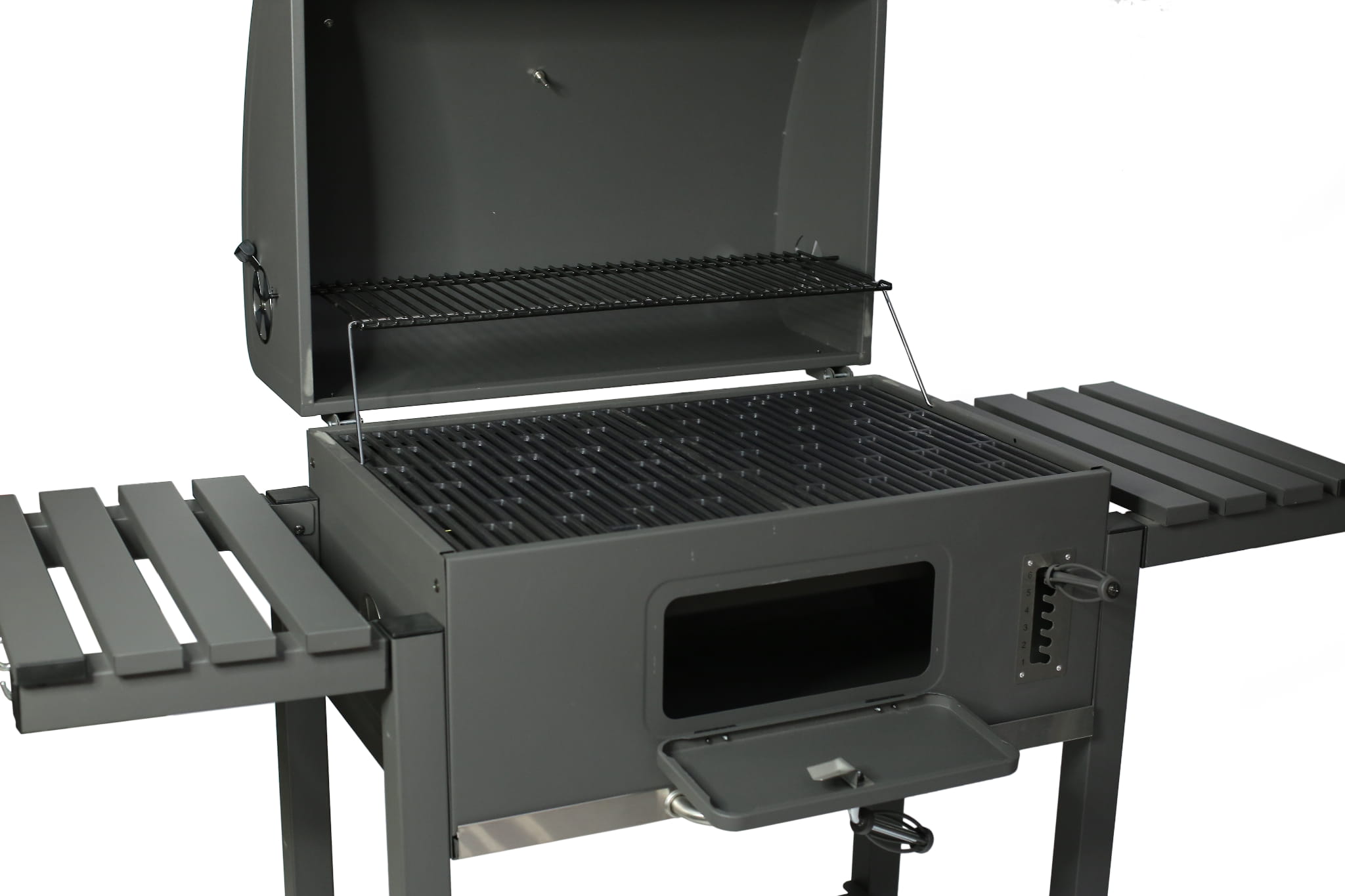 - sterowanie temperaturą grillowania za pomocą płynnej regulacji wysokości paleniska