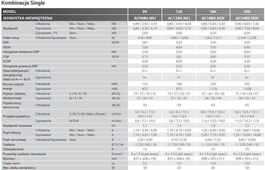 | Poziom ciśnienia akustycznego jednostki wewnętrznej dla chłodzenia min./maks. (dBA) | 31 / 44 |
