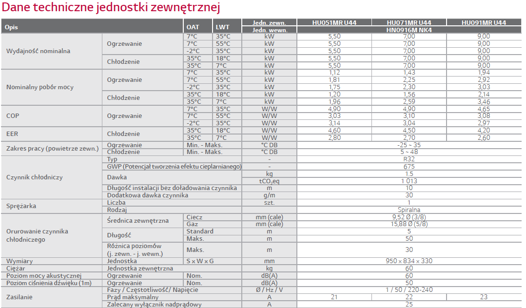 - 3 wydajności jednostek (5/7/9 kW) do ogrzewania i chłodzenia.