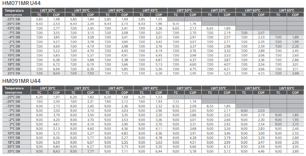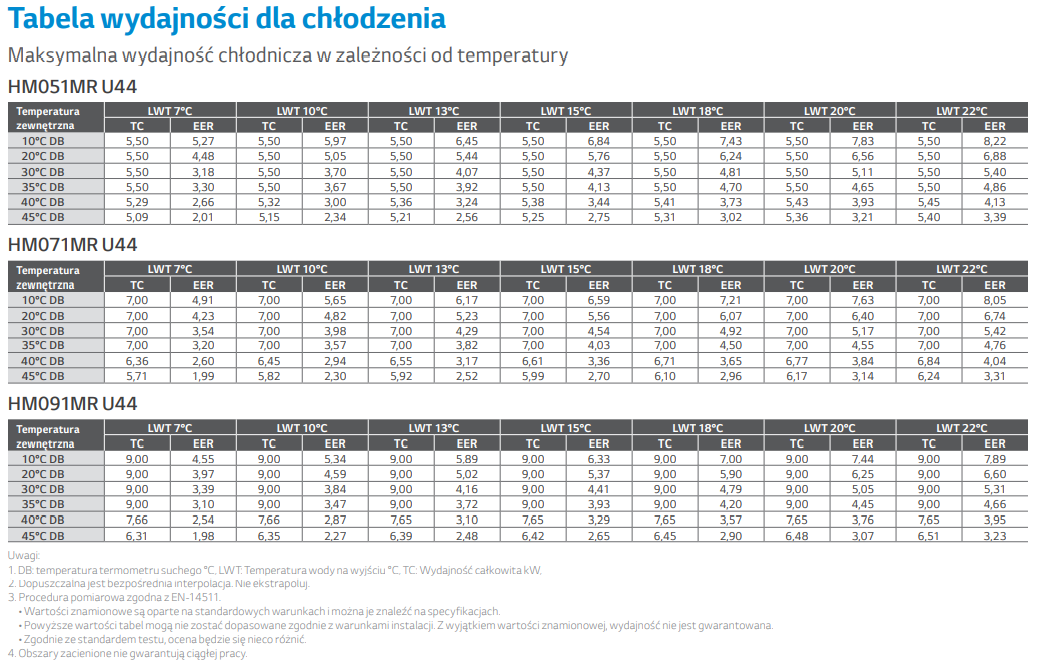 - 100% wydajności trybie grzania przy temperaturze zewnętrznej -15°C (średnia temp. wody na wyjściu 35°C , z wyjątkiem modelu o mocy 16kW)