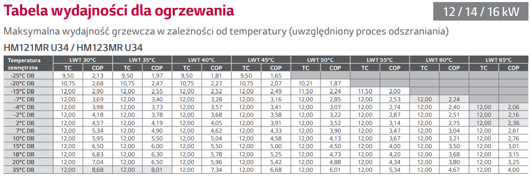 - 100% wydajności trybie grzania przy temperaturze zewnętrznej -15°C (średnia temp. wody na wyjściu 35°C , z wyjątkiem modelu o mocy 16kW)