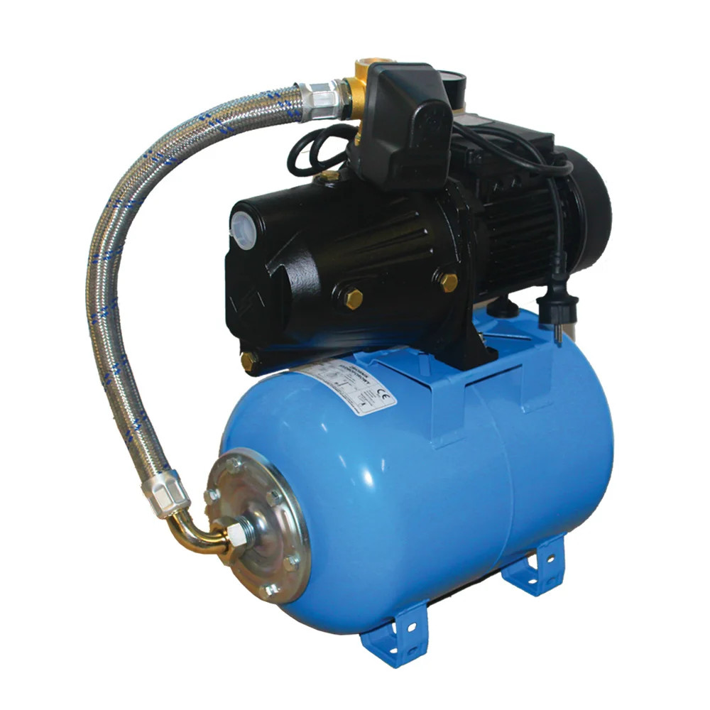 Tradycyjny zestaw hydroforowy składający się z jednowirnikowej pompy odśrodkowej typu JET100A,osprzętu oraz zbiornika ciśnieniowego dobieranego pod indywidualne potrzeby klienta (24l, 50l, 80l lub 100l).
