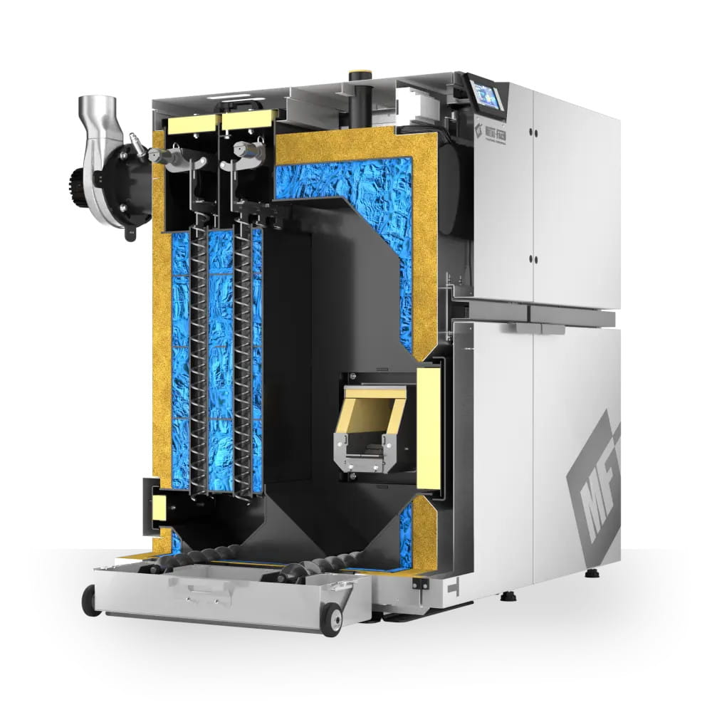 - Automatyczne usuwanie popiołu i osadów – mechanizm czyszczący regularnie usuwa nagromadzone osady, zapewniając optymalne warunki spalania.