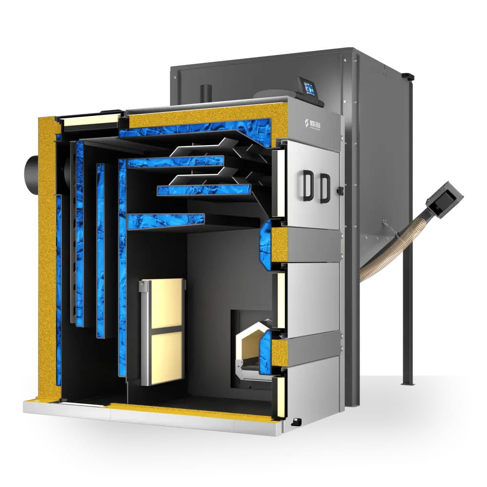 - Automatyczne usuwanie popiołu i osadów – mechanizm czyszczący regularnie usuwa nagromadzone osady, zapewniając optymalne warunki spalania.