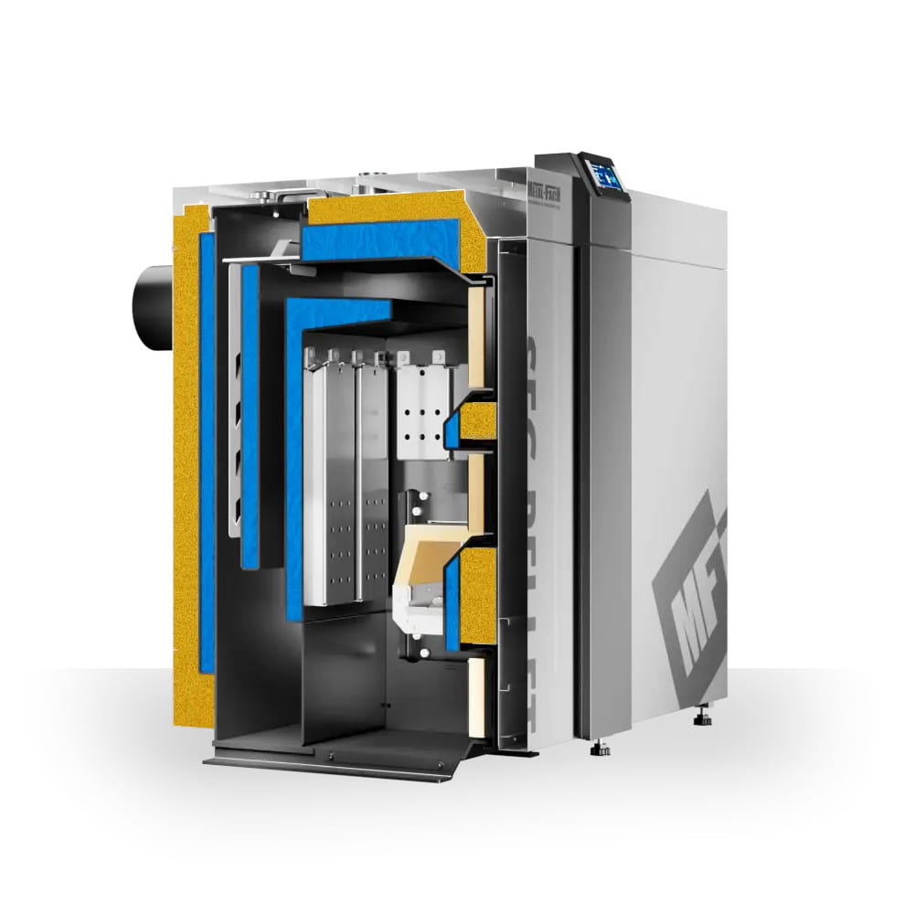 - Automatyczne usuwanie popiołu i osadów – mechanizm czyszczący regularnie usuwa nagromadzone osady, zapewniając optymalne warunki spalania.