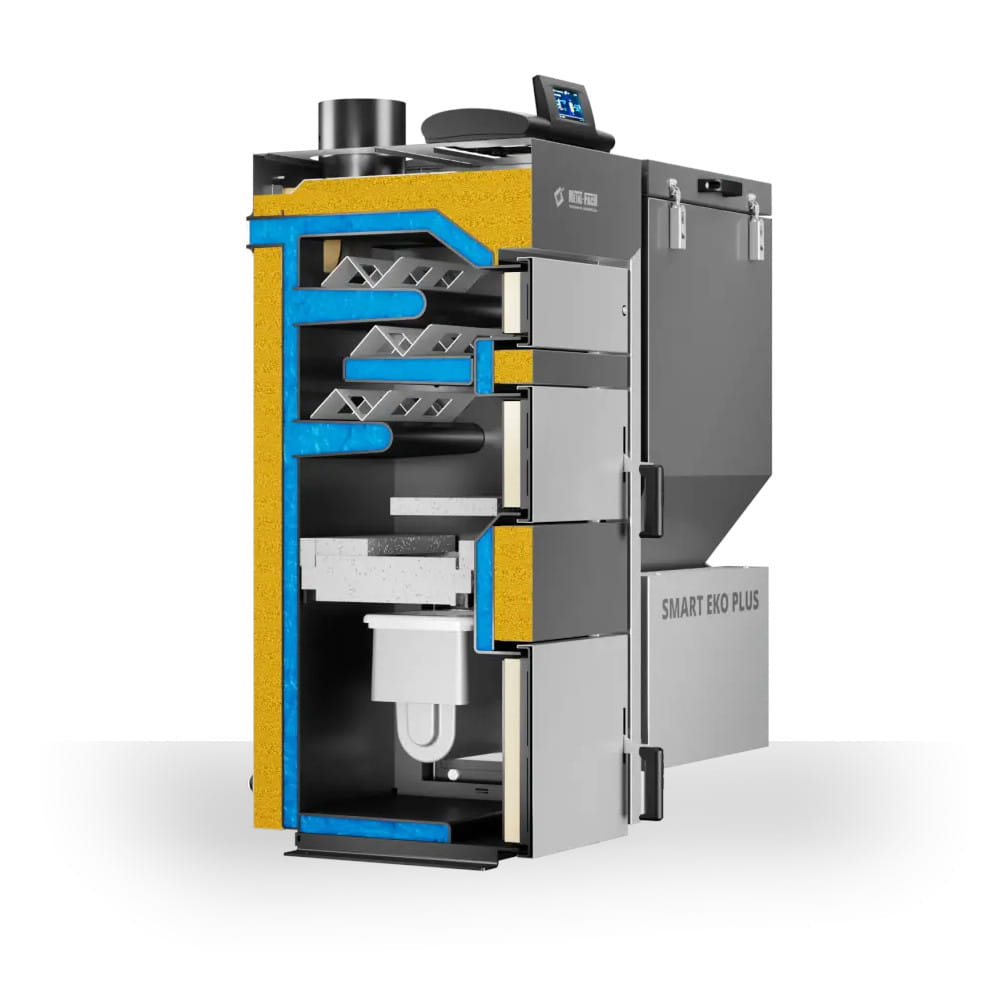 METAL-FACH SMART EKO PLUS KOCIOŁ NA WĘGIEL GROSZEK Z AUTOMATYCZNĄ ZAPALARKĄ I PODAJNIKIEM PO PRAWEJ STRONIE 15 KW – CZOPUCH DO GÓRY LUB DO TYŁU