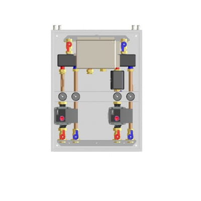 - Fabrycznie spasowane podzespoły: sprzęgło hydrauliczne, termostatyczny zawór mieszający, armatura, sterownik umożliwiający współpracę zkotłem