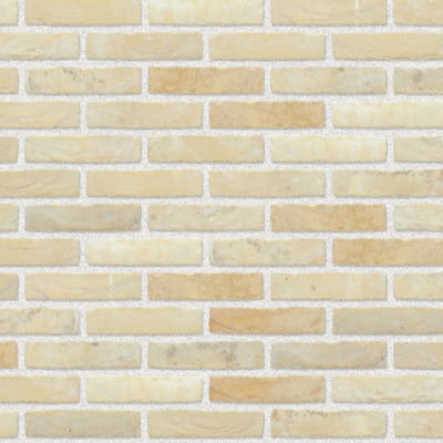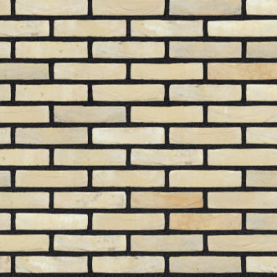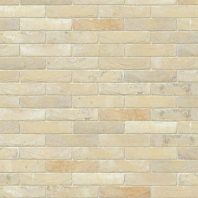 Cegła ma żółtą podstawę. Różne rodzaje piasku odpowiadają za kolory, od żółtego do delikatnego różu z odcieniami beżu i szarości.