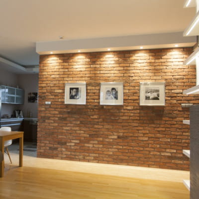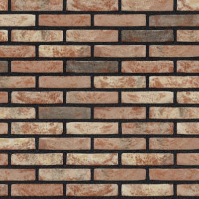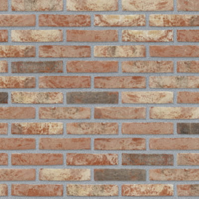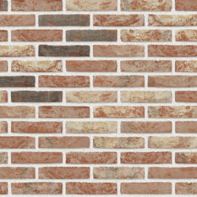Cegła ma czerwoną podstawę z odcieniami szarości, czerwono-beżowego koloru oraz czerni.