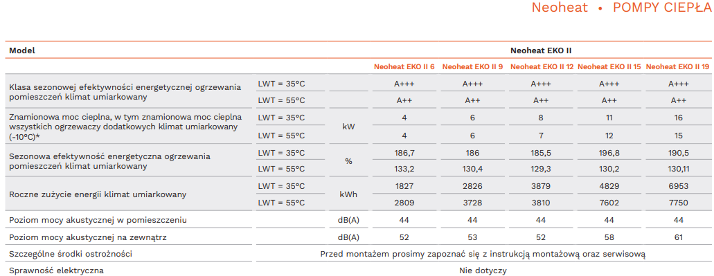Pompa Ciepła Neoheat Eko to idealne główne źródło ogrzewania dla domów jednorodzinnych. Umożliwia podgrzewanie wody użytkowej, a także chłodzenie latem. Użytkownik ma możliwość wyboru rodzaju obiegu ciepła. Pompa wyposażona jest w dotykowy panel sterujący, który ułatwi programowanie i pozwoli na stałą kontrolę temperatury w domu. Sterownik posiada tryb wakacyjny, automatyczne funkcje przełączania w tryby ogrzewania i chłodzenia i wyświetla aktualny stan pracy. Dodatkowo istnieje możliwość instalacji modułu Wi-Fi i zarządzaniapompą poprzez komputer.Neoheat Eko to urządzenie o wysokiej sprawności, które zagwarantuje oszczędność czasu i zadba o Twój budżet. Pompa ciepła Eko posiada wbudowany zawór trójdrogowy do rozdziału CWU i CO. Urządzenie jest dostosowane do współpracy z różnymi rodzajami dostarczania ciepła, np. grzejniki, klimakonwektory, ogrzewanie podłogowe. Możliwe jest łączenie wymienników i ustawianie na nich różnych temperatur.