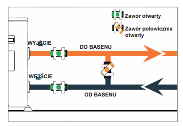 Pompę ciepła można połączyć z basenem za pomocą BY-PASS. BY-PASS to zespół składający się z 3 zaworów do regulacji przepływu wody przez pompę ciepła. W trakcie prac konserwacyjnych obejście pozwala na odcięcie pompy ciepła od systemu bez przerywania montażu: