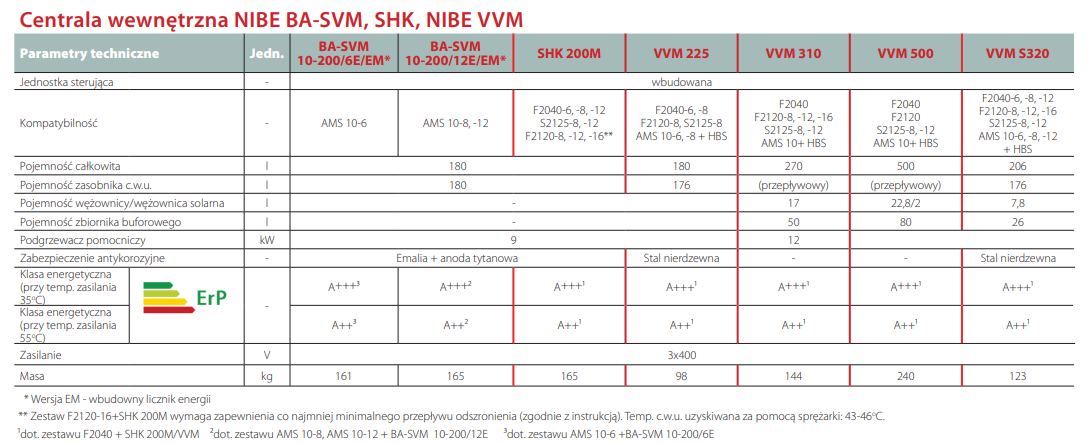 NIBE BA-SVM, SHK oraz NIBE VVM to kompletne centrale wewnętrzne, z wbudowanym sterownikiem i zintegrowanym zasobnikiem wody, przeznaczone do współpracy z powietrznymi pompami ciepła NIBE typu monoblok i split. SHK oraz BA-SVM wyposażone są w wężownicowy zasobnik wody o pojemności 180l, moduł elektryczny, grupę bezpieczeństwa, naczynie przeponowe, manometr, elektronicznie sterowaną pompę obiegową i skraplacz (dotyczy BA-SVM). SHK może współpracować z pompami ciepła NIBE MONOBLOK, a BA-SVM z jednostkami zewnętrznymi pomp ciepła typu NIBE SPLIT. Kontrolę urządzeń zapewnia wbudowany sterownik z kolorowym wyświetlaczem. Centrale wewnętrzne NIBE VVM 225/310/500 wyposażone są w intuicyjny sterownik z kolorowym wyświetlaczem. Model VVM 310/500 to jednostka ze zintegrowanym przepływowym zasobnikiem wody i grzałką elektryczną o mocy 12 kW, a VVM 225 posiada zintegrowany wężownicowy zasobnikiem wody o poj. 180 litrów i grzałkę elektryczną o mocy 9 kW. Z kolei model VVM S320 to najbardziej zaawansowana technologicznie centrala z dotykowym, kolorowym wyświetlaczem, a także zintegrowanym wężownicowym zasobnikiem wody o poj. 180 litrów i grzałką elektryczną o mocy 9 kW. Centrala VVM 500 przeznaczona jest do większych rezydencji lub budynków wielorodzinnych. Przystosowana jest do ogrzewania basenu, podłączenia systemu solarnego, dodatkowego zasobnika wody lub innych źródeł ciepła.