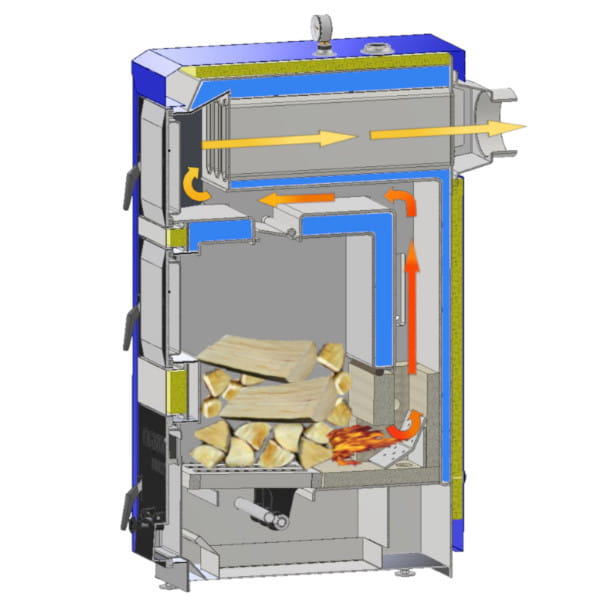 Atestowana blacha kotłowa. Wymiennik wielociągowy poziomo rurowy o dużej sprawności cieplnej. Zastosowano turbulizatory spalin dla zwiększenia sprawności.