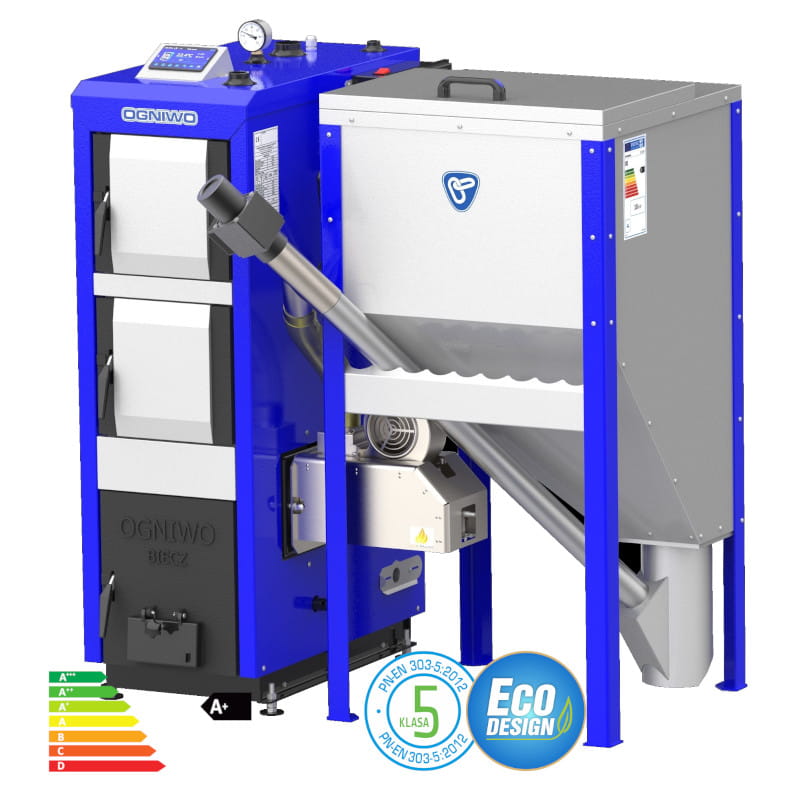 Najwyższą możliwą klasę dla kotłów spalających pellet. niska emisja zanieczyszczeń do atmosfery – kocioł spełnia wymagania 5 klasy oraz wymogi dyrektywy EKODESIGN.